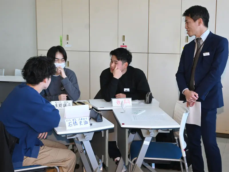 「教育と探求社」大阪営業所コーディネーターの植村誠輝さんが司会を務めました。三菱UFJモルガン・スタンレー証券神戸支店の奥副支店長と平野課長、三菱UFJ銀行明石支店取引先第一課の松尾課長を特別講師に招き、ワークショップ形式で株投資や経済について学生がグループ討議しました。